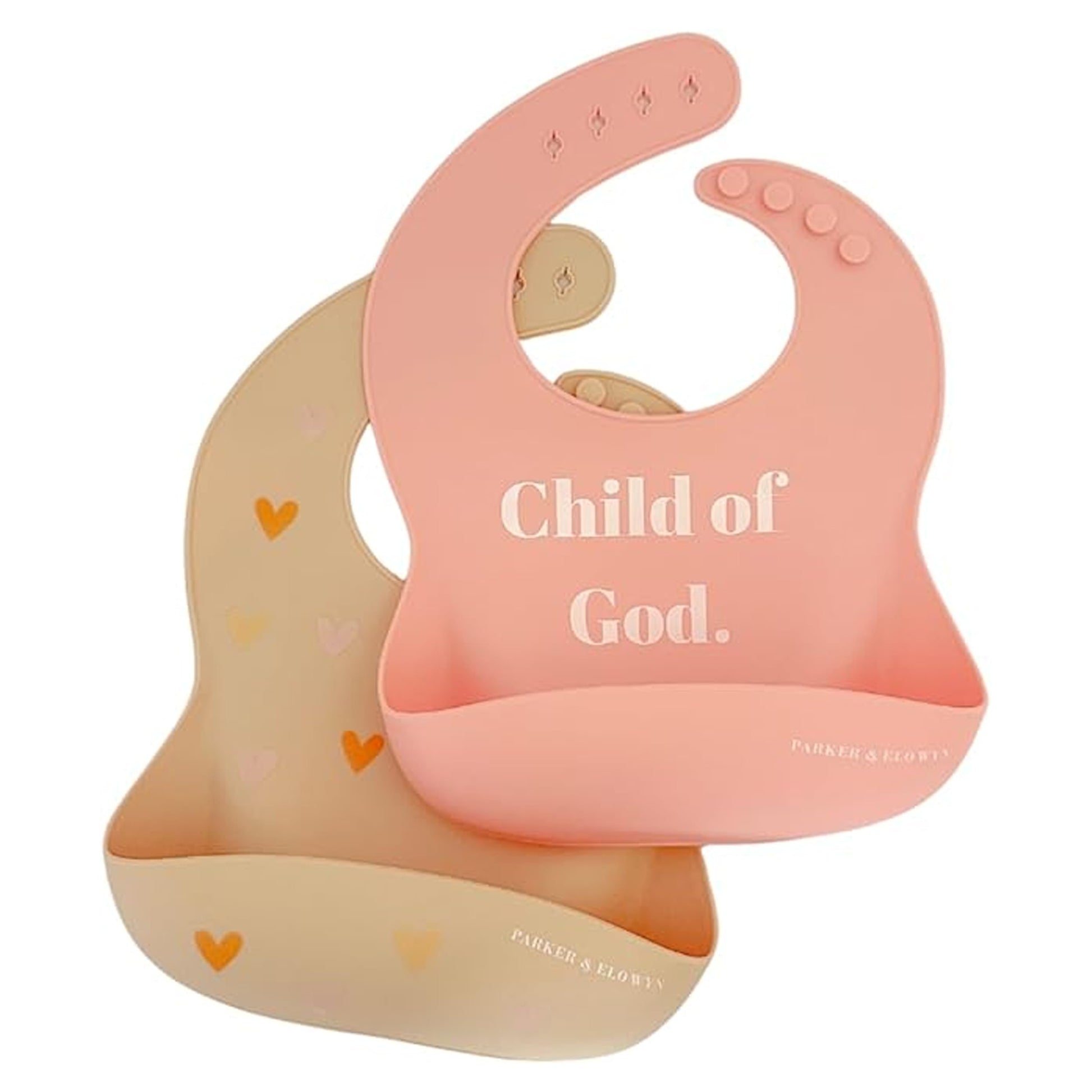 PARKER & ELOWYN Silicone bibs | Child of God | Pack of 2 Silicone Bibs for Baby Boy or Girl | 100% Silicone Bibs for Babies 3 months +